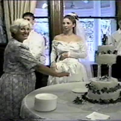 Action begins at 25 seconds. A man and woman cut their wedding cake, and then they shove it in each other's faces but the man's pants fall down. Music rights not cleared.