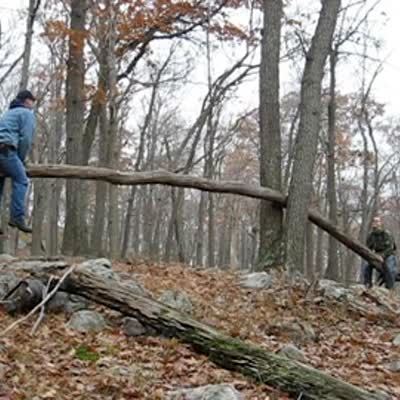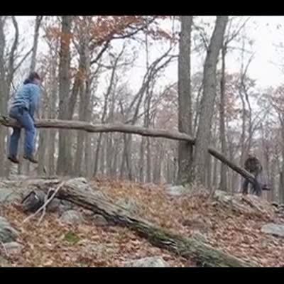 2 men sit on opposite ends of a fallen tree wedged between other trees. Men rock up and down like they're on a seesaw. The tree breaks when man on the left rocks too hard.