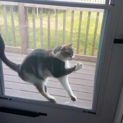 A cat is stuck between the glass and a screen in a door indoors. wedged. window