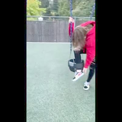 A teen girl gets her foot stuck inside a baby swing seat, but then she gets it out but accidentally bumps into the pole behind her.