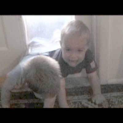 A cat hiding in a cabinet opens the door and pulls on the tail of a second cat, startling it and causing it to be wedged between the cabinet door and the floor.