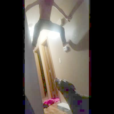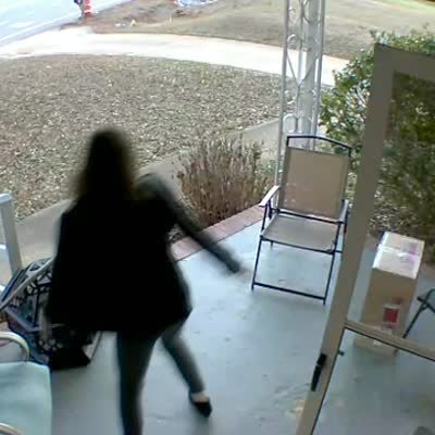 A woman runs and jumps off the front-porch in wedge heels and falls on the sidewalk. Security footage.