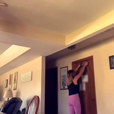 A woman pulls back on elastic bands wedged into her door, and they snap back into her face.