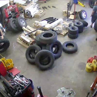 A man in a garage lifts a large tire. He drops the tire over his head and he falls down under the weight of the tire. No audio.