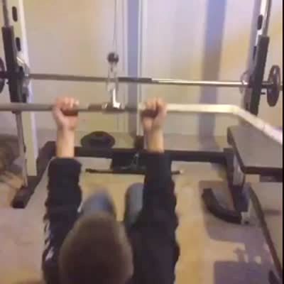 A young boy works out, lifting a barbell, in front of the camera. Then the boy says "I'm gonna get a girlfriend today."