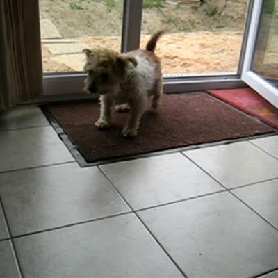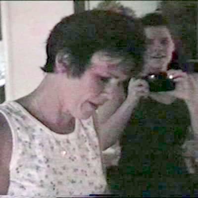 A woman and a man walk into a house. The woman bends down and holds her arms out towards a young boy. The boy runs past the woman and over to the man standing behind her. Security footage.