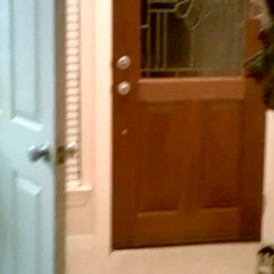 Man wearing werewolf mask scares young woman when she comes in from garage. Practical joke. .