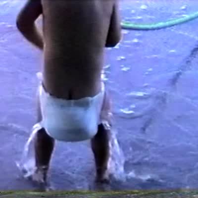 Boy sits in grass holding net while ducks eat in front of him. He's waiting to catch one, dad sets off sprinkler behind boy. Wets him, practical joke. Boy says he has water in his pants.