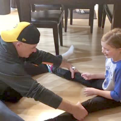 A woman pours a cup of water on the floor and challenges her son to try to mark her hand before she can wipe up the puddle of water. She counts to three but instead of wiping it up, she pulls him into the puddle to get the seat of his pants wet. Practical joke.