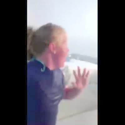 A boat drives up to a bubble net of humpback whales in the ocean, and the woman behind the camera jumps as a group of whales emerge from the water in front of the boat.
