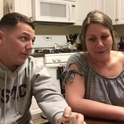 A man asks his mom what sound a whale makes and spits water in her face in a kitchen as he tells her a joke and his dad laughs.