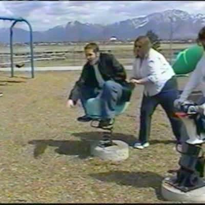 Teen boy at a park rides a whale on a big spring. He swings to and fro until he leans back and breaks the spring.