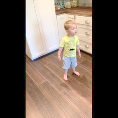 A tot boy babbles while he asks why the house moves when he spins around in circles in the kitchen.