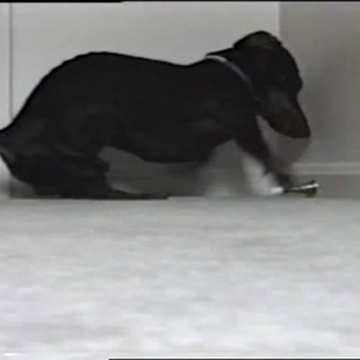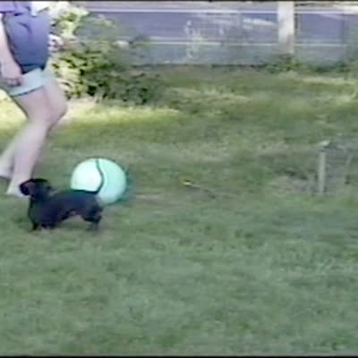 "Pooch Pounces Prey" A dachshund dog rolls a ball that stops in front of the camera. He then slowly approaches the ball one step at a time before he gets close enough to pounce on it and take it away.