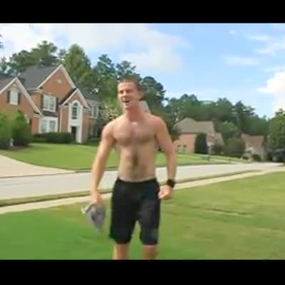 A basketball flies over a house and lands in a hoop in the front yard. A man runs out of the garage screaming and takes off his shirt. He thanks Jesus, his family, and a "little wiener dog."