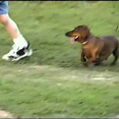 Backwards trained wiener dog - owner says "run" and "go" and "get outta here" and dog stands there, owner yells "stay" and dog takes off running