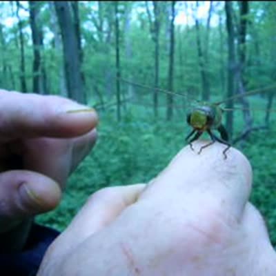 Man has a dragonfly on his hand in the woods, the bug gives the man's finger high fives. Insect.