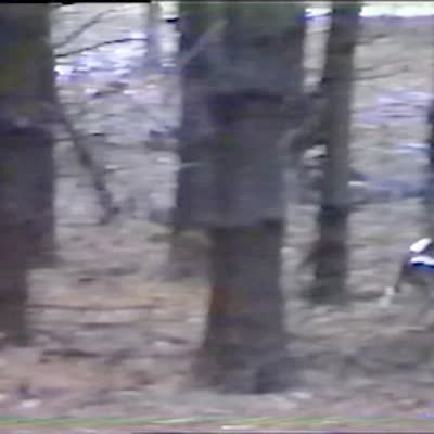 A chipmunk jumps onto a woman's backpack in the woods, and she screams, then it climbs onto her shoulder before jumping to the ground.