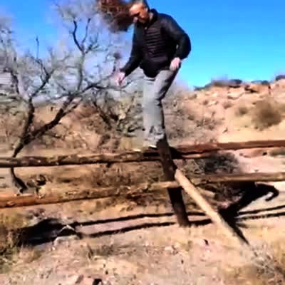 A man walks along the top of a log fence during a hike in the wilderness. He slips and falls to the ground.