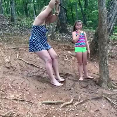 A hesitant woman rides a rope swing down a hill and over a lake. When she does not jump into the lake, she swings back towards the hill, then slips on mud and then falls into the water.
