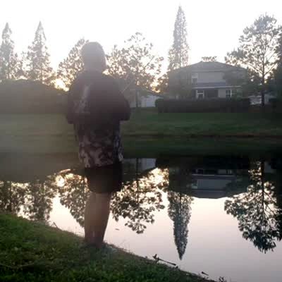 "Gator Steals Reel" A man fishes on a pond and reels in a large fish. Then an alligator jumps out of the water and steals the fish, and the man screams and runs away.