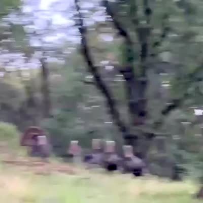 A man loses control of a golf cart and rolls backwards down a hill at a golf course. Then he jumps out and the cart crashes into trees.