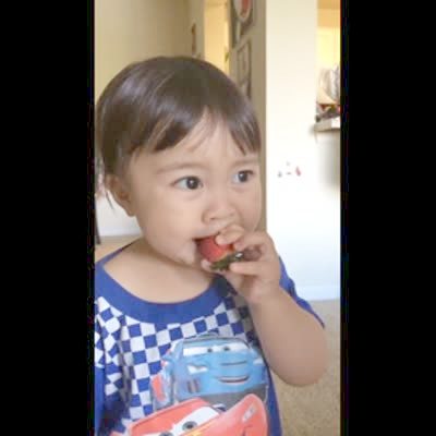 A tot boy eats a strawberry in slow motion at home and makes a sour face, sticking his tongue out.