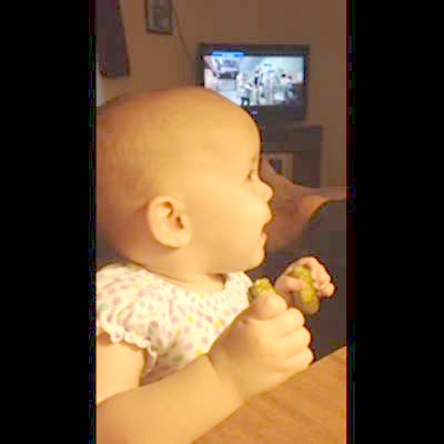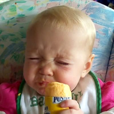 A baby girl gasps when she tries a taste of a pickle at home, then spits it out. Sour
