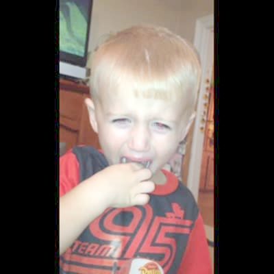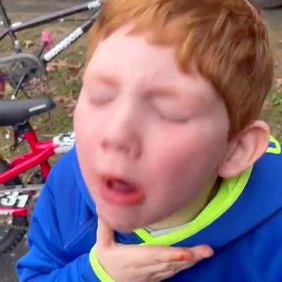 A young boy eats an oyster in the backyard as the man behind the camera encourages him. The young boy struggles to keep the oyster down but eats it and winces.