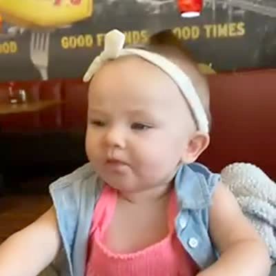A baby girl tastes lemonade and grimaces then shakes in the restaurant. Featured talent cleared only (the baby).