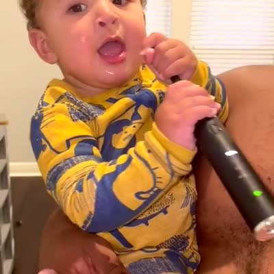 A baby boy puts an electric toothbrush in his mouth and winces, shakes and giggles at the vibration.