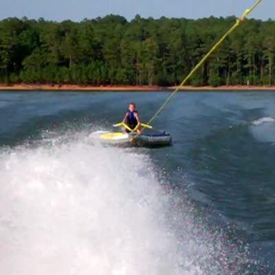 Boy rides innertube behind boat on lake, innertube gets picked up by wind and slams back into water, throwing boy off.