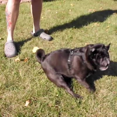 Woman holds pug on porch, she "winds him up" by rubbing dog's butt, then the dog spins in circles and barks in a pile of leaves.