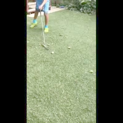 A teen boy hits a golf ball in a backyard and breaks a window.