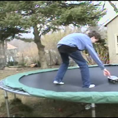 Preteen boy on a skateboard on a trampoline. The skateboard shoots off the trampoline and crashes / breaks a window.