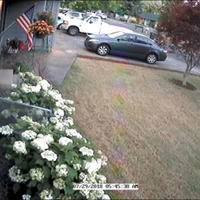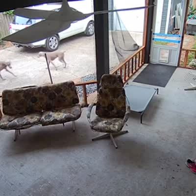 Three deer run up the driveway, then break a window in the garage while a man watches. Security footage.