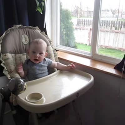 A baby boy sits in high chair by a window. Dad is sneaking outside to scare him. Dad bangs on the window to scare the baby and the window breaks.