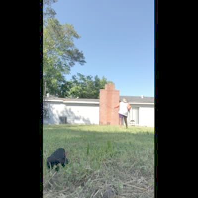 A teen girl throws a soft ball against the chimney and one slips away from her and she breaks a window.