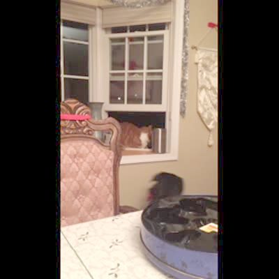 A cat sits in the window sill in the living room indoors and paws at a dog when it barks at it. The screen on the window somehow breaks off and the cat loses its balance and falls out the window.