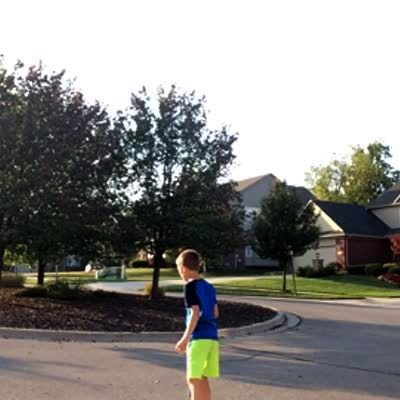 A young boy throws an axe at a target on a porch, but he misses and breaks a window. Security footage.