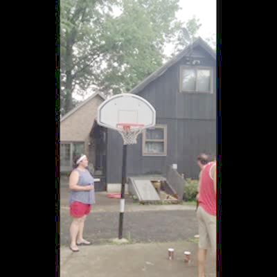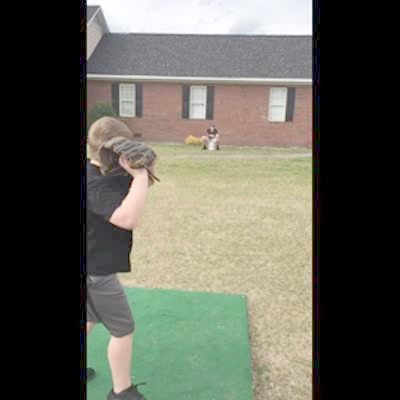 A man and his teen daughter play catch in a driveway with a baseball. The father overthrows the ball and it breaks a window of the house. Security footage.