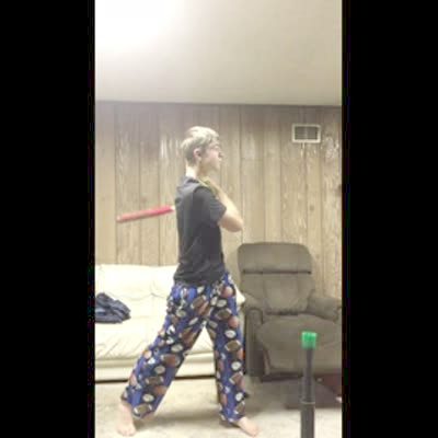 Three boys dance on a back yard and a porch sidewalk. One boy shakes his butt by a glass door. He smacks the door with his butt and breaks the glass. Action 1 minute to end. Short tails. Caucasian.