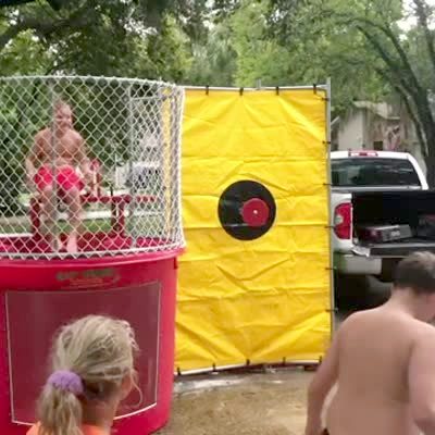 A young boy throws a ball at a dunk tank target, but it slips from his hand and breaks a truck window.