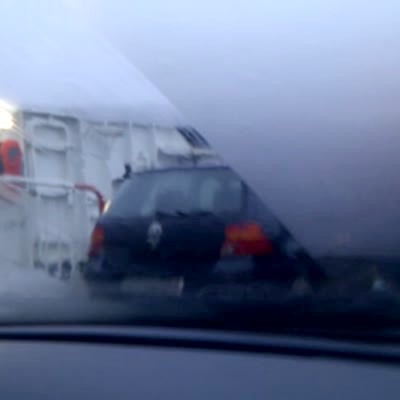 A mouse climbs on a car windshield and slides back down and a woman in the car says "What is this?"