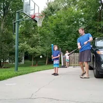 A baseball hangs from a basketball net by a string, and a young boy learns to hit the ball with a baseball bat in his front yard. His dad swings a bat to show him how to hit the ball. The bat swings behind him, and cracks the windshield of the man's car.