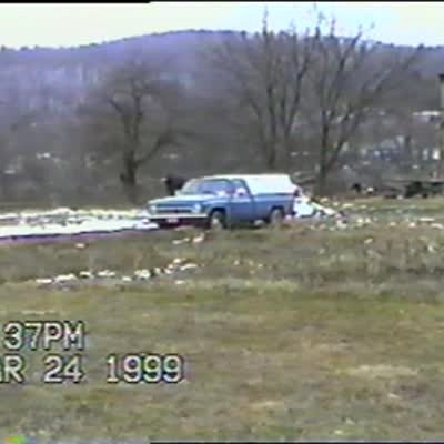 Two young men drive a pick-up truck into a ditch and crash, causing things to fall out of the bed of the truck. They laugh as they look at the cracked windshield and other damage.