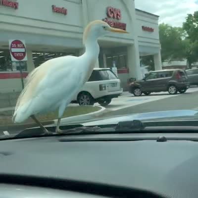 "Popcorn Pecker" Ostrich tries to eat popcorn sitting in a car, through the windshield. Bird.