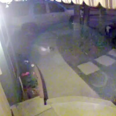 "Feline Makes a Bee Line" A cat bursts through a screen window when it sees a cat outside. No audio - from a security camera.