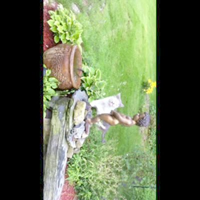 "Fountain Feline" Gray and white cat drinks from peeing boy statue in back yard. Needs to be rotated.