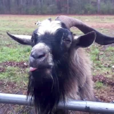 "Billy Goat Groan" A goat gobbles and spits over a fence at a woman while she talks to it.